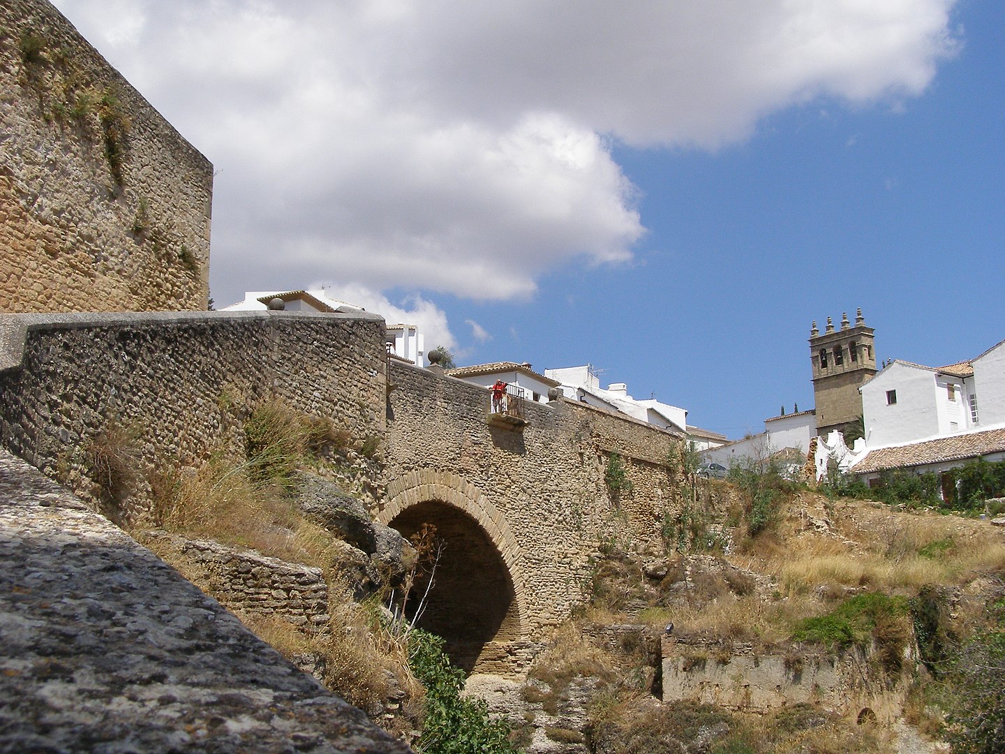 Puente Viejo (Spanish pronunciation: [ˈpwente ˈβjexo], "Old Bridge") is the second oldest and second lowest of the three bridges that span the 120-metre (390 ft) deep chasm that carries the Guadalevín River and divides the city of Ronda in southern Spain.Despite its name ('Old bridge'), it is newer than the Puente Romano ('Roman bridge'). It was built in 1616, and currently only carries.