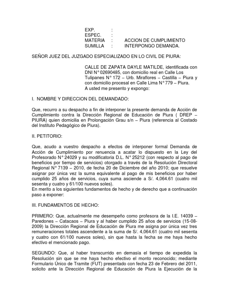 DEMANDA DE ACCION DE CUMPLIMIENTO Demanda judicial Ley estatutaria Prueba gratuita de 30