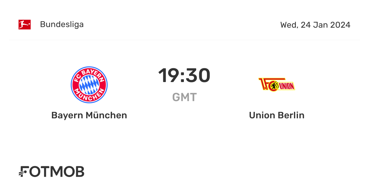 FC Union Berlin vs FC Bayern München live score, H2H results, standings and prediction. 1. FC Union Berlin - FC Bayern München. 1. FC Union Berlin is going head to head with FC Bayern München starting on 20 Apr 2024 at 16:30 UTC at An der alten Försterei stadium, Berlin city, Germany. The match is a part of the Bundesliga.