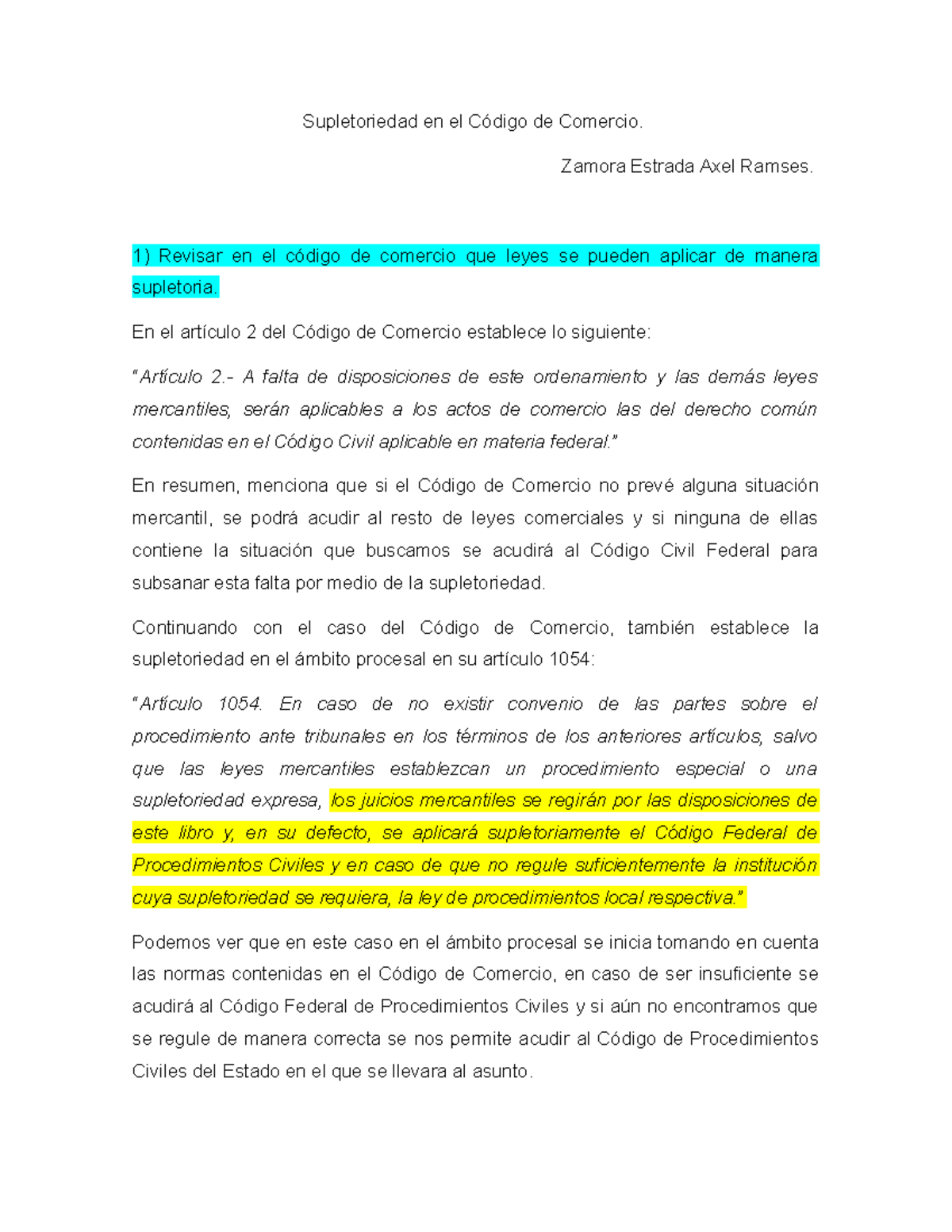 Supletoriedad en el Código de Comercio Zamora Estrada Axel Ramses. Revisar en el código de
