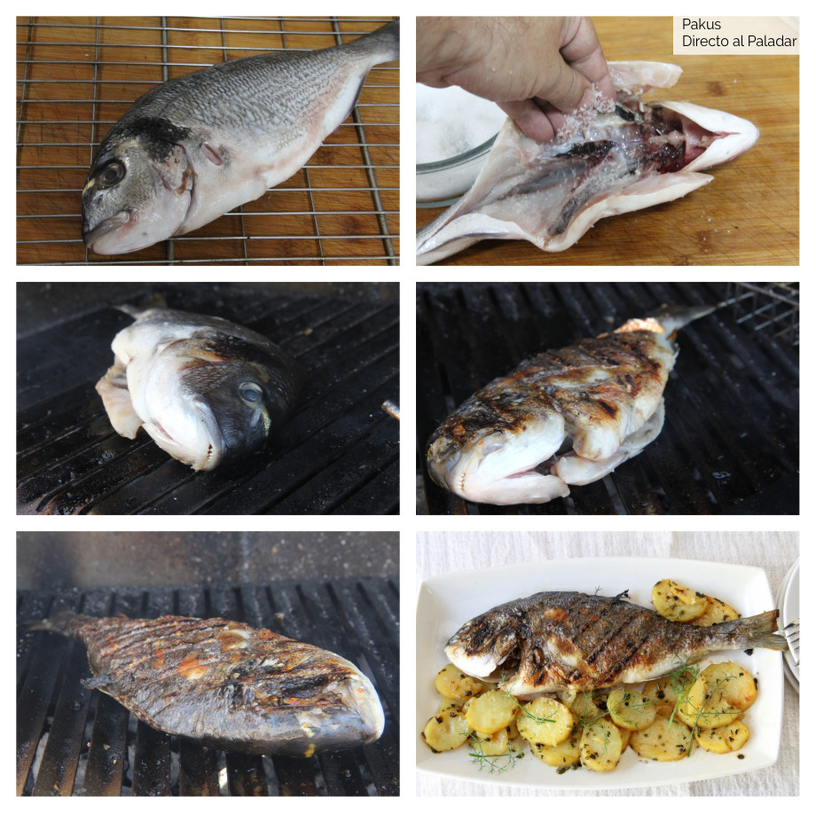 Pasos de la receta. 1. Pedir en la pescadería las doradas limpias sin pelar las escamas y sin tripas, dejando la cabeza. De buen tamaño. 2. Nos hacemos con una buena brasa, si es posible de encina. 3. En casa las pasamos por agua de nuevo para retirar restos y se salan por dentro y por fuera. 4.