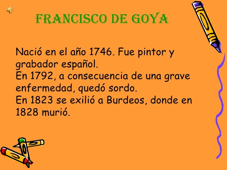 Francisco de Goya Francisco de Goya nació el 30 de marzo de 1746 en la localidad de Fuendetodos (cerca de Zaragoza).. En torno a 1773 regresó a su país y se presentó a varios proyectos para la. Los horrores de la guerra dejaron una profunda huella en Goya, que contempló las batallas entre franceses y españoles durante los años de.