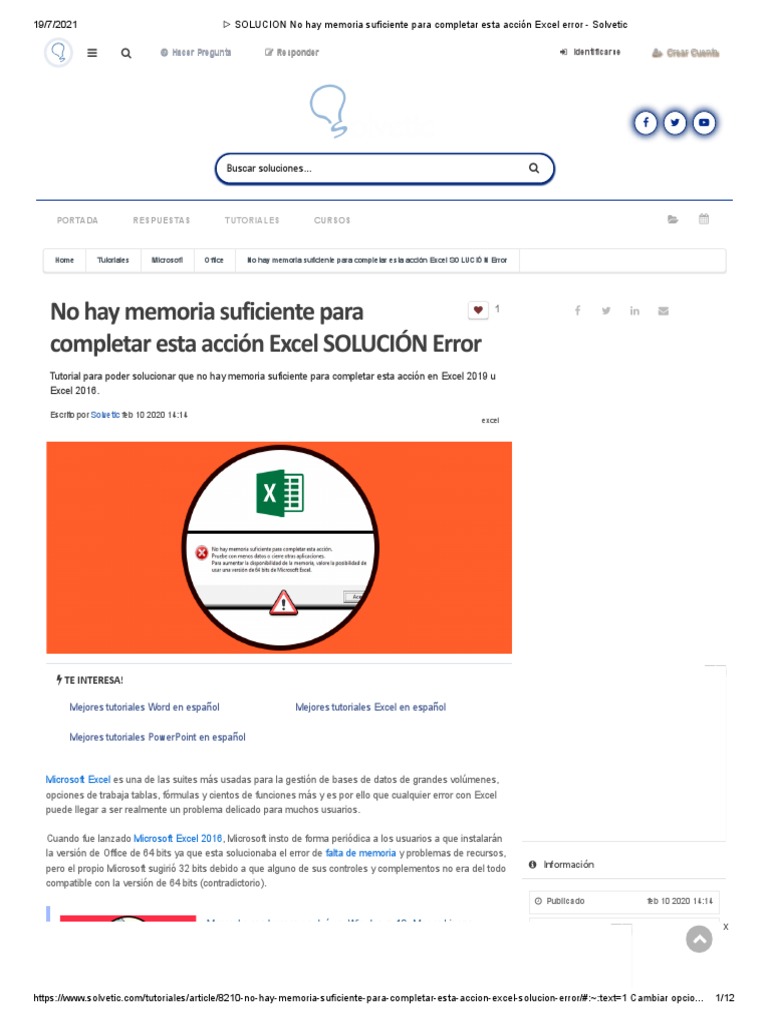 SOLUCION No Hay Memoria Suficiente para Completar Esta Acción Excel Error Solvetic PDF