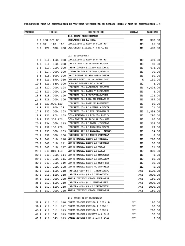 Partidas Para La Construccion de Vivienda Unifamiliar de Acabado Medio