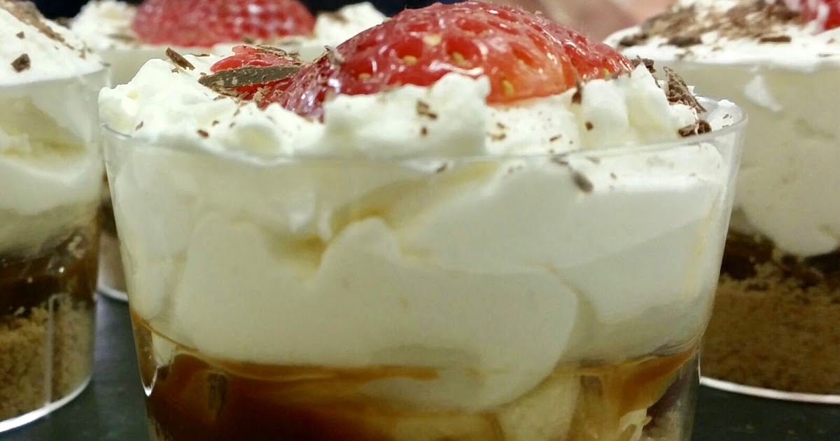 300 g de dulce de leche; 2-3 plátanos maduros (en rodajas de aprox. 5 mm) 400 g de nata fría (35% de grasa) 100 g de queso cremoso; 50 g de azúcar; 10-15 g de chocolate fondant para postres (50% cacao) PREPARACIÓN: Pon en el vaso las galletas y la mantequilla y tritura 20 seg/vel 7. Reparte la mezcla en 8 vasos bajos, cubre con el dulce de.