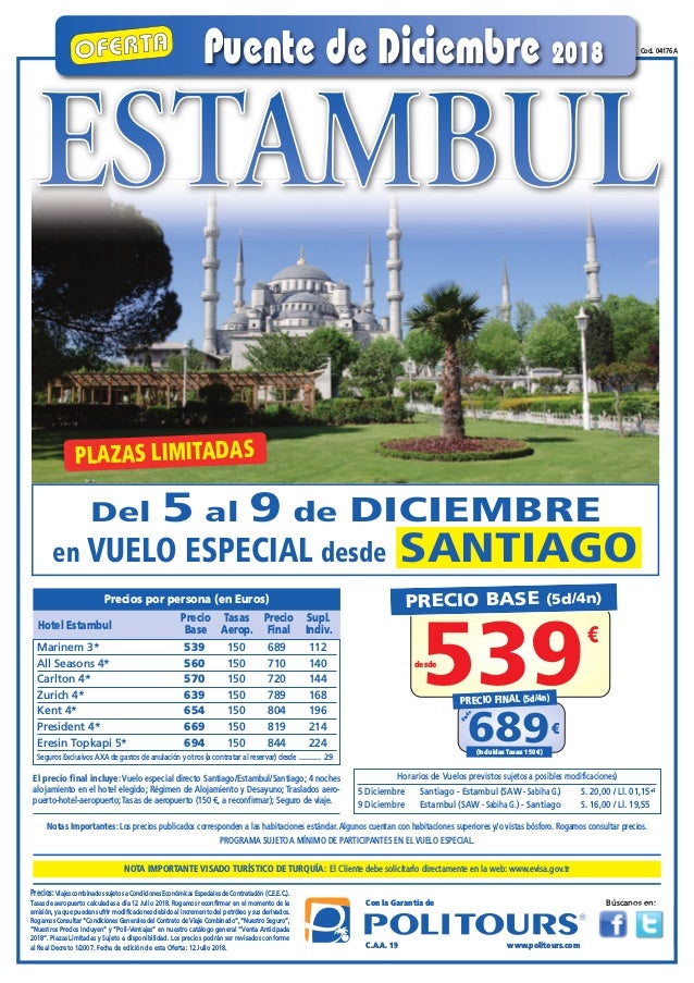 6 días / 5 noches. Salida el 5 de diciembre desde Bilbao y Valladolid. Régimen Según Programa. Desde1.120 €. Descubre Estambul. Turquía- Estambul. 5 días / 4 noches. Salida el 6 de diciembre desde Bilbao, León, Palma de Mca, Pamplona, Santiago, Sevilla, Vitoria y Zaragoza.